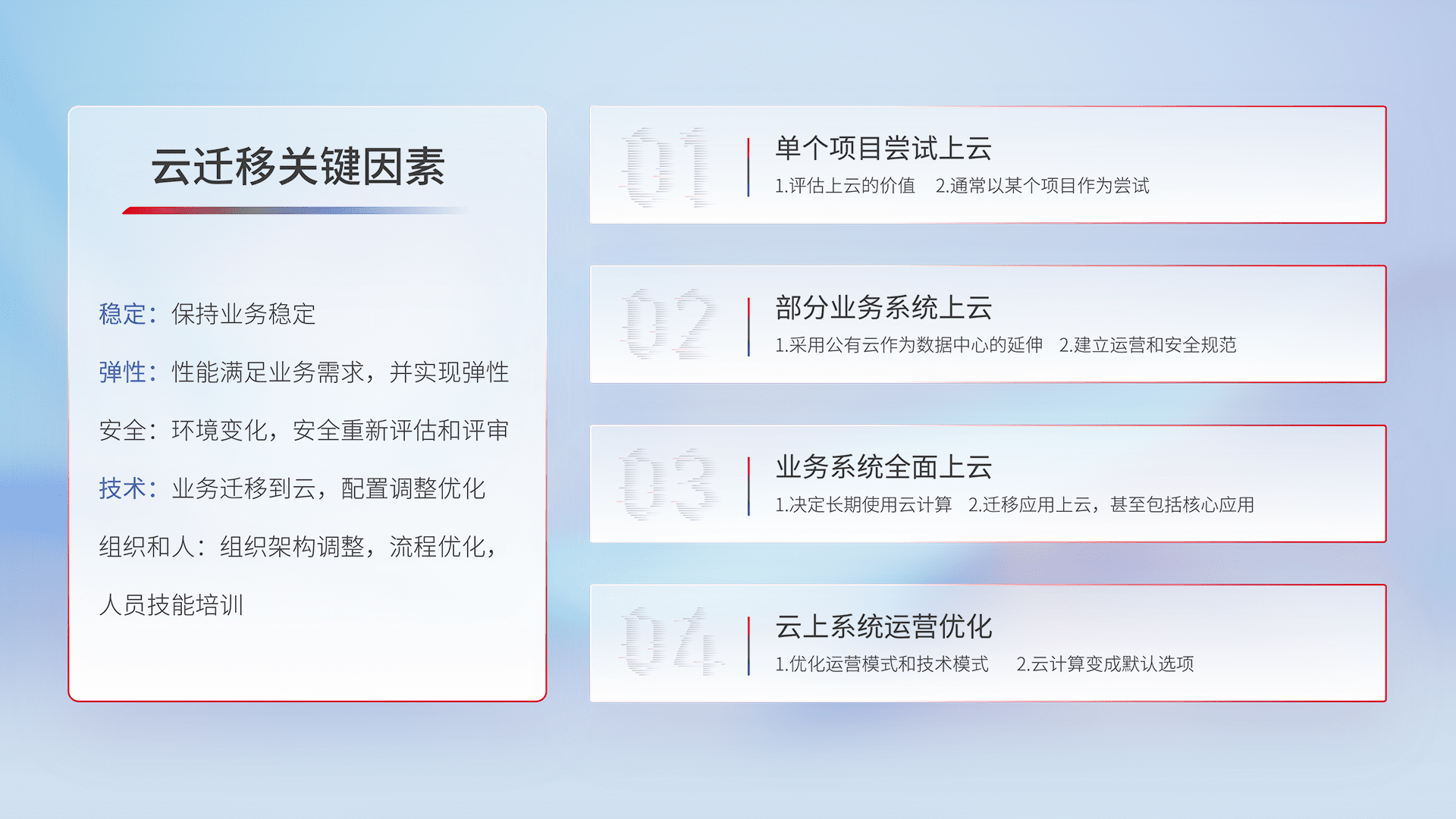 结合实际业务,,从规划设计、、云平台选型、、云原生改造、、、、数据迁移、、、集成交付,,,迁移全过程为客户识别最佳上云路径,,,,做好风险识别管理,,设计网络架构、、、身份权限、、、安全审计合规、、、、操作审计、、、日志审计、、、监控告警策略、、、多站点容灾设计等,,,,对云上基础设施进行整体规划,,提升IT治理水平,,,以满足弹性、、高可用、、、、高性能的需求。。。。