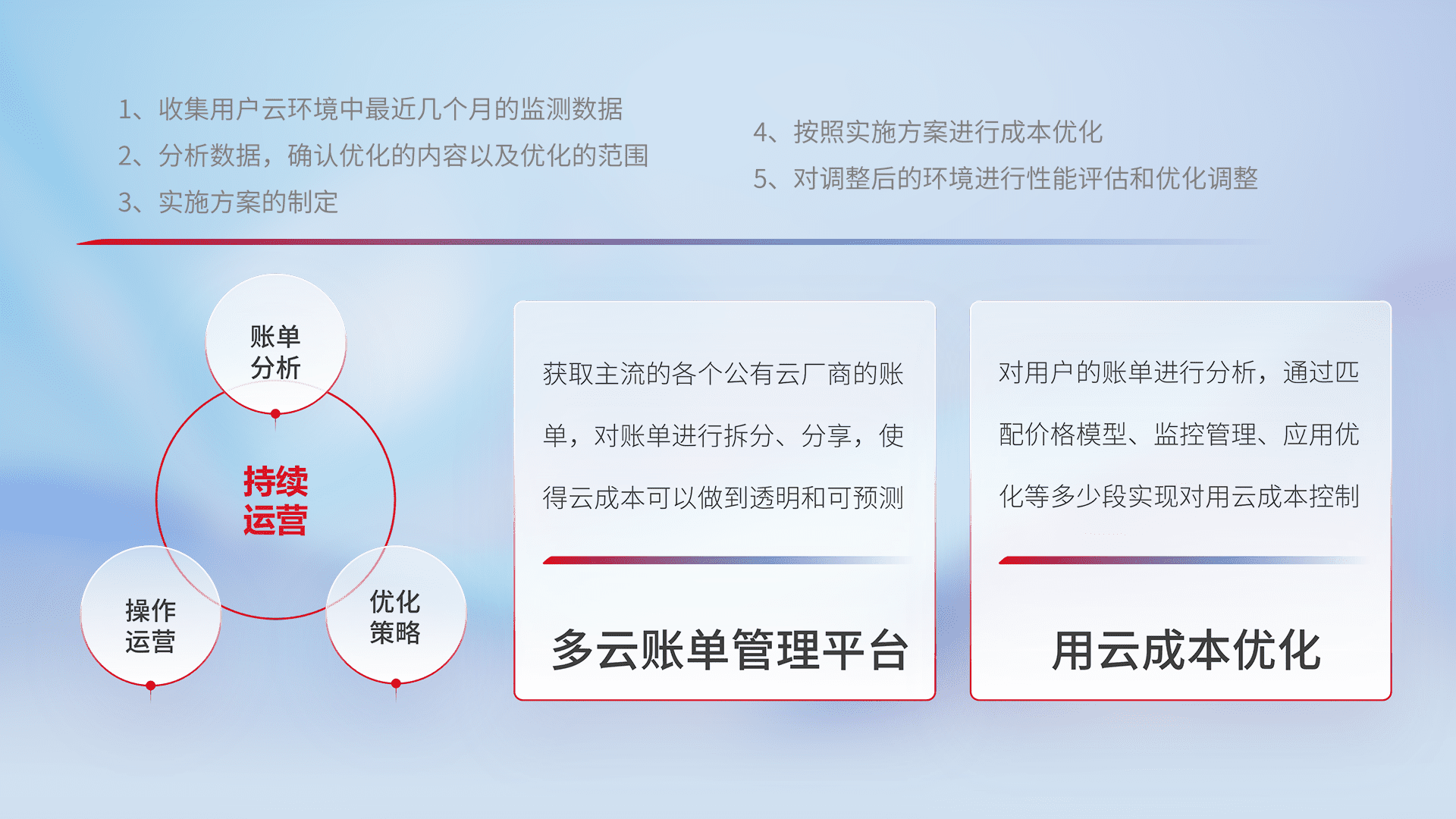 通过多云纳管,,,以统一的资源数据模型把客户的云资源进行抽象和封装,,,,进而实现对多云资源的统一操作,,保障云资源管理的可靠性、、稳定性与可用性。。量身定制化运维内容,,,,配置、、、、开发运维、、、、补丁管理、、、备份、、、监控、、、认证和访问管理、、、、审计和日常巡检等,,保障在用云过程中的可靠度,,,稳定度以及高可用率。。。
