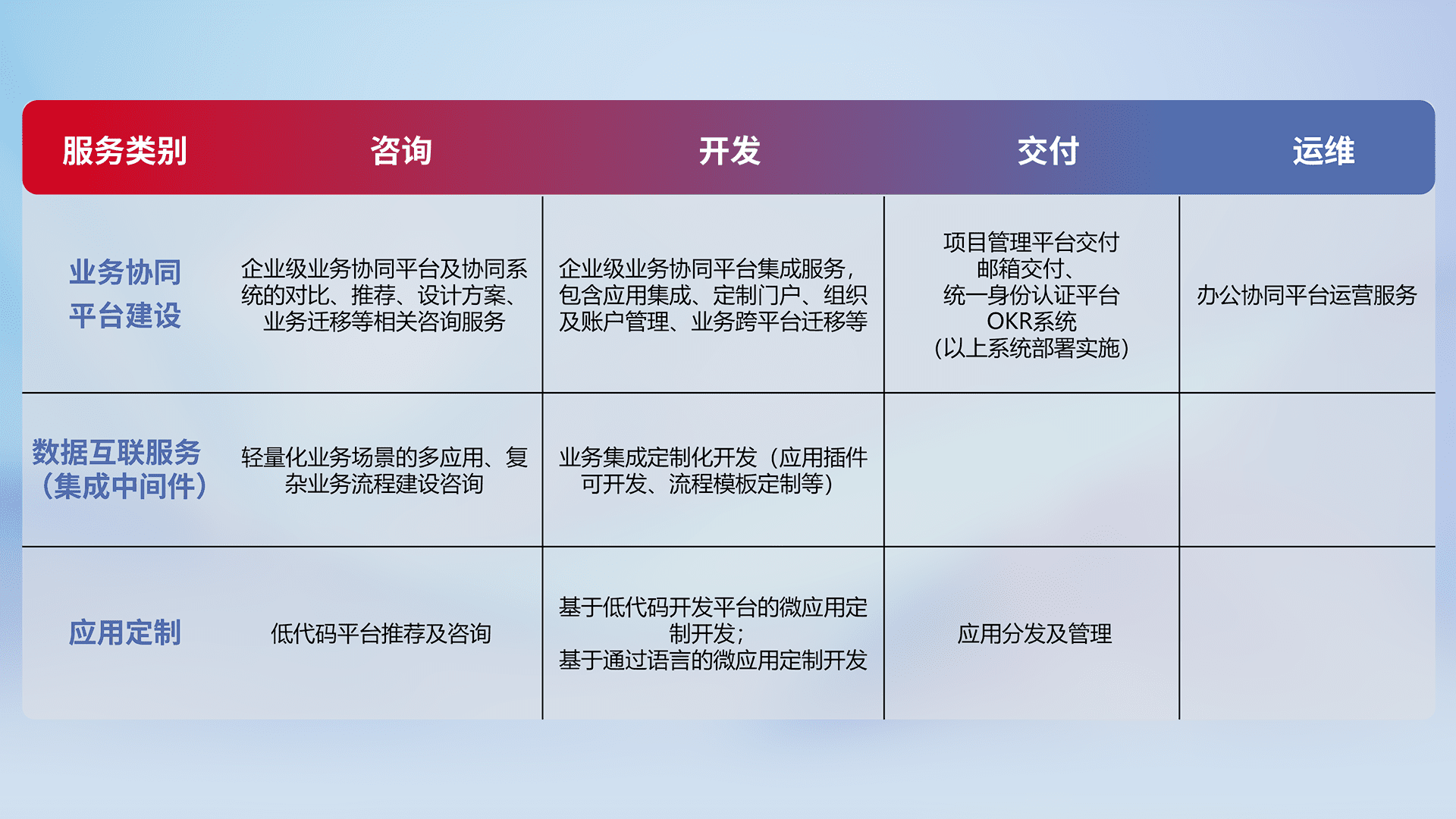 针对钉钉、、企微、、、、IDaas等平台级产品提供产品的规划、、、方案、、、交付、、、、定制化开发等服务,,,,实现如统一协同办公、、智能客户服务、、、混合会议管理、、、、智能数据查询、、等业务场景,,,,实现数字化转型。。。。